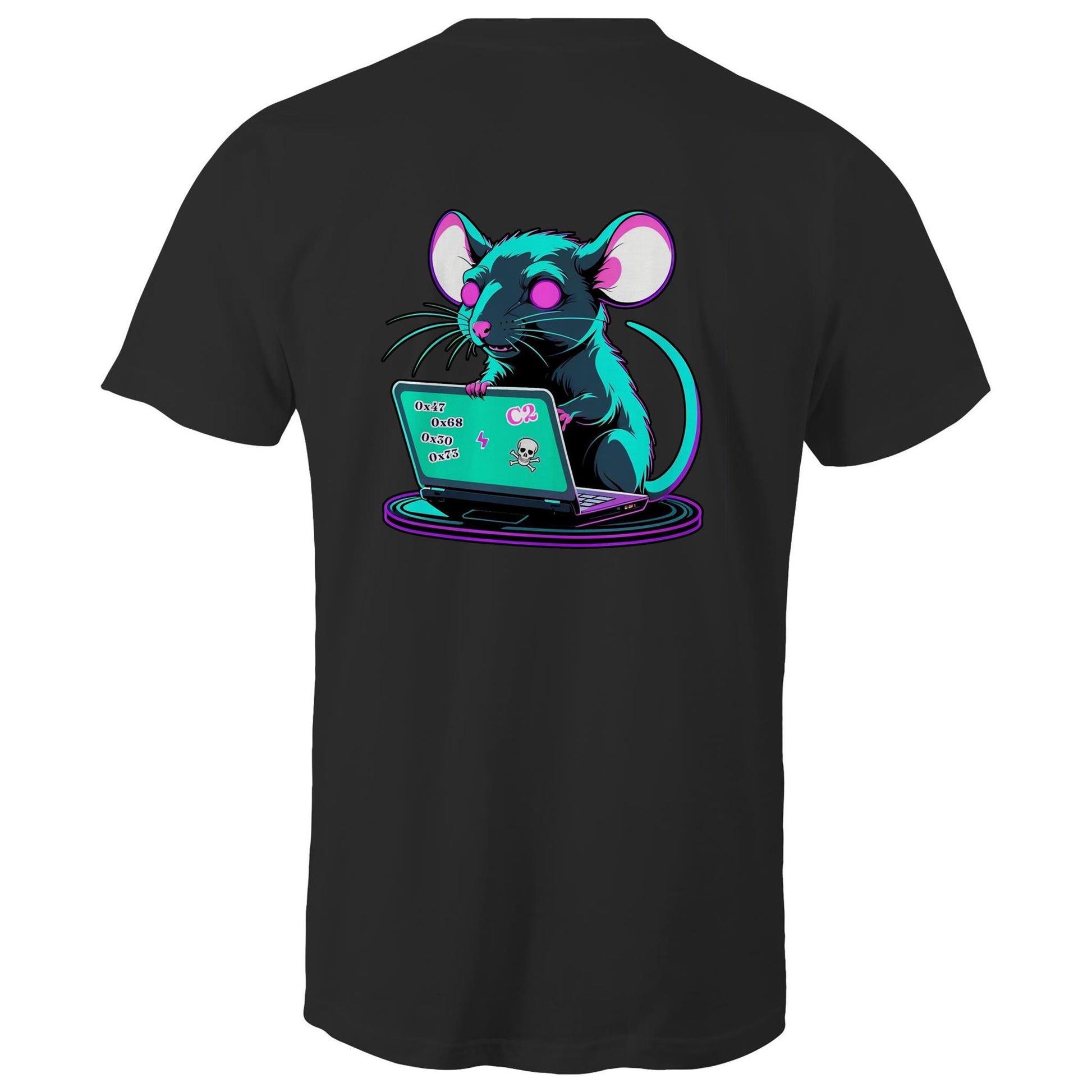 Back: A ghostly rodent silhouette crouched behind a laptop — soulless glowing eyes locked in, clawed hands mid-command. On the back of the laptop: the actual HEX values for the Gh0st RAT magic header (0x47 0x68 0x30 0x73), alongside a custom “C2” tag and a subtle skull icon to mark its payload origins.