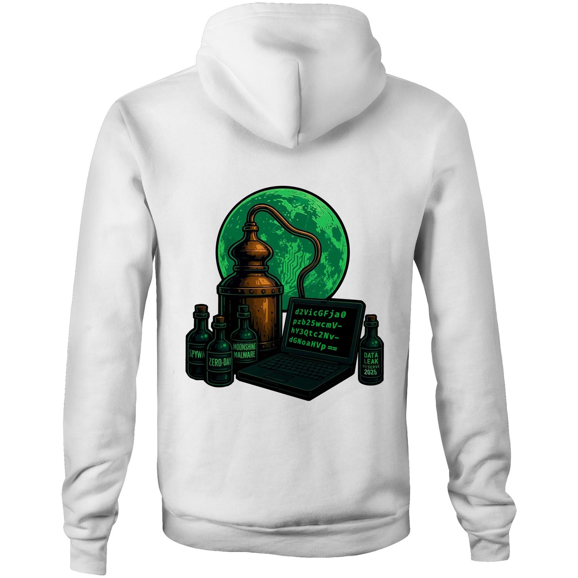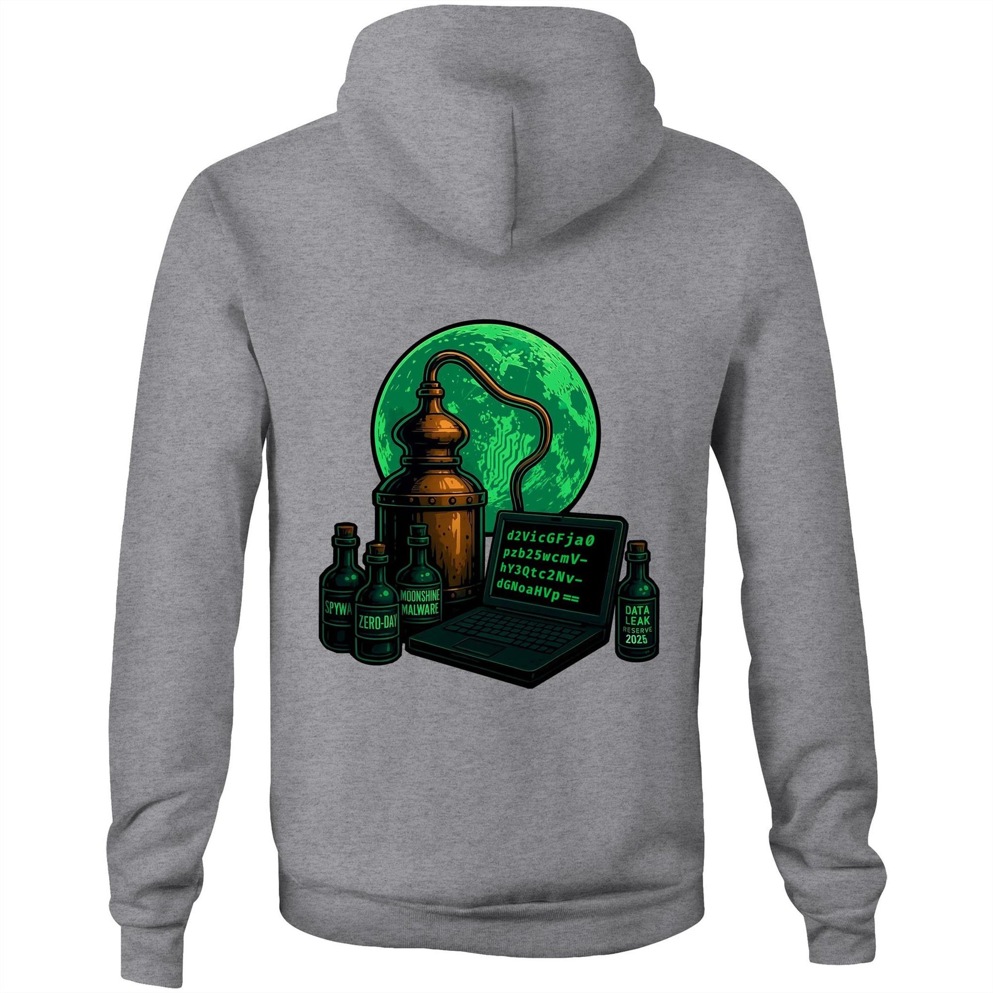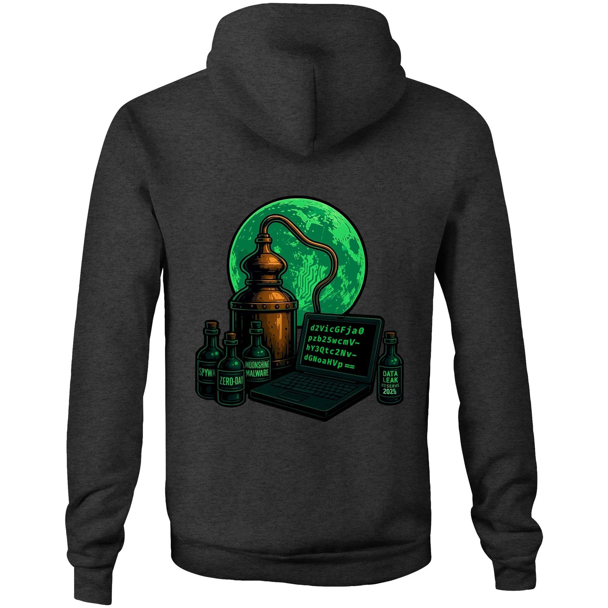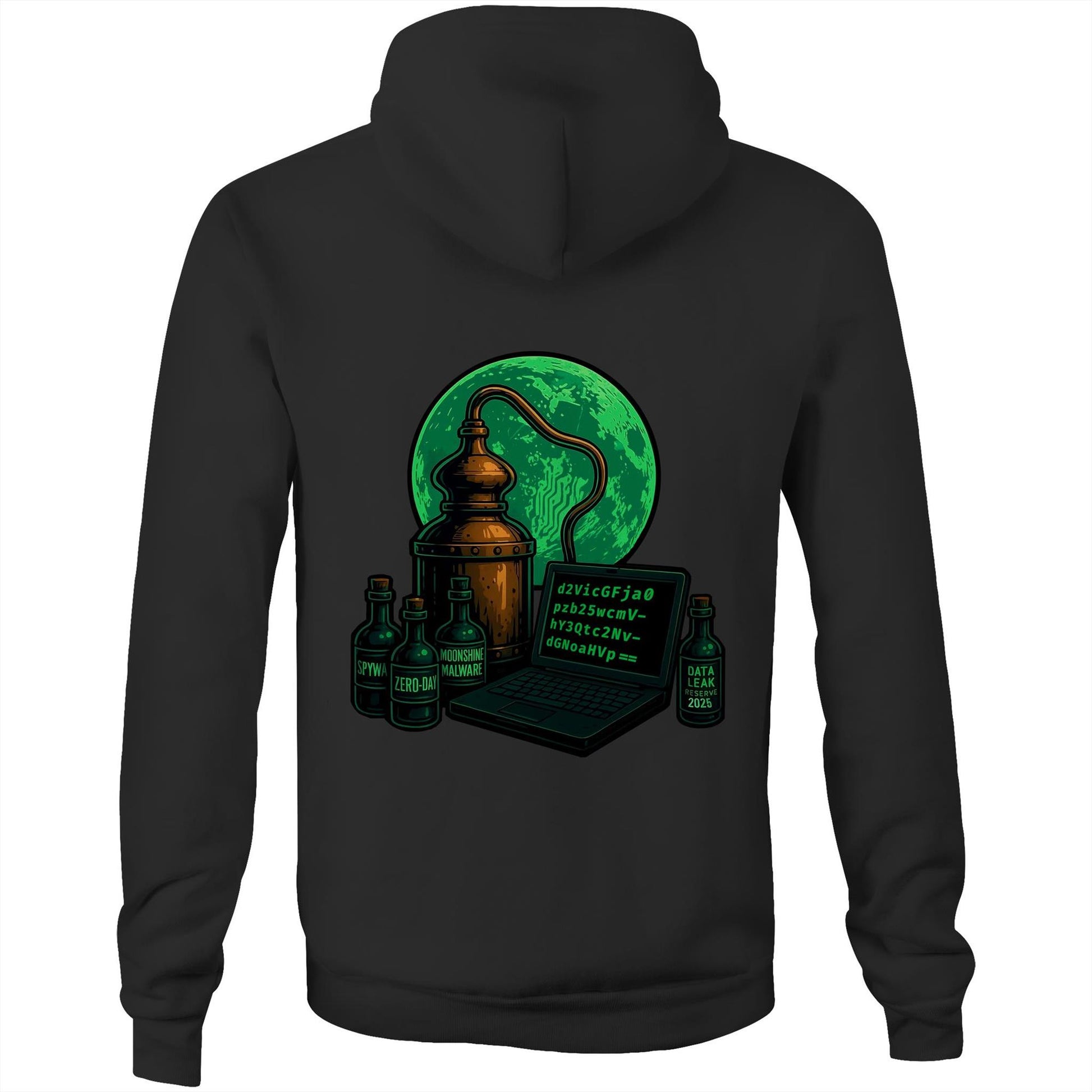 On the back, a glowing green moon rises behind a copper still, distilling more than just spirits. Bottles are tagged with warnings: Spyware, Zero-Day, and Data Leak Reserve 2025. Centered is a terminal outputting a Base64-encoded snippet—a nod to the obfuscation tactics used by Moonshine to conceal its code